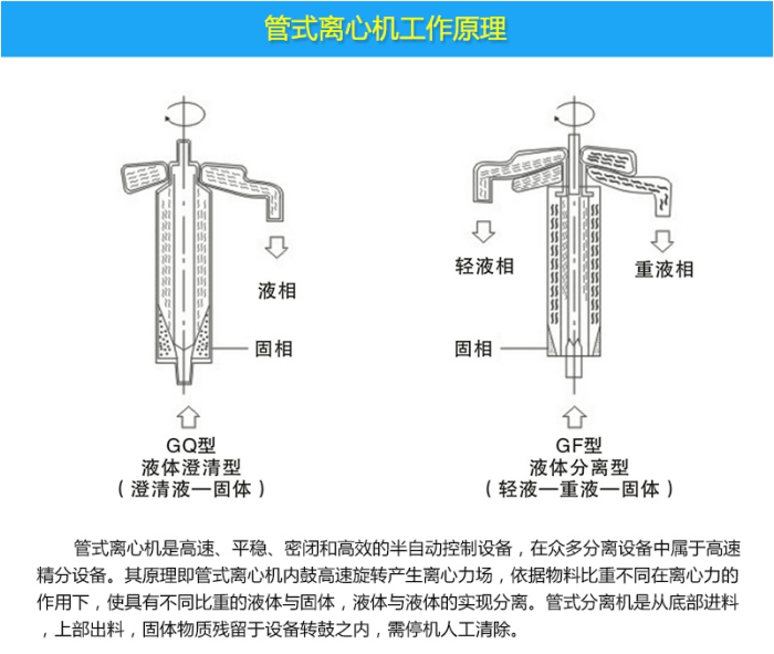 管式離心機是一種高轉速、高分離因數的分離機。通常適用于固體含量低于1%、固體小顆粒及固體與液體的密度差很小的懸浮液的澄清;也適用于輕液與重液的密度差小且分散性很高的乳濁液的分離。